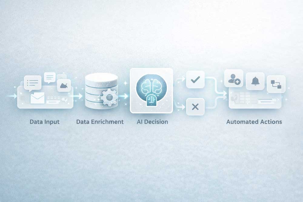 AI automation removes this layer entirely. Instead of moving data manually, workflows connect systems directly. When an event happens in one system, it triggers actions across others without human intervention.